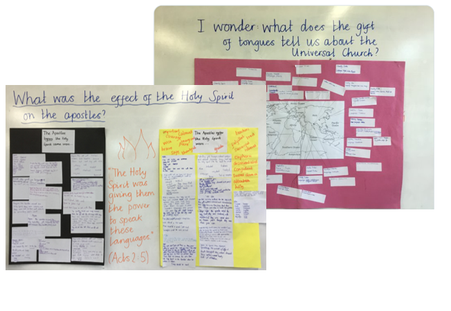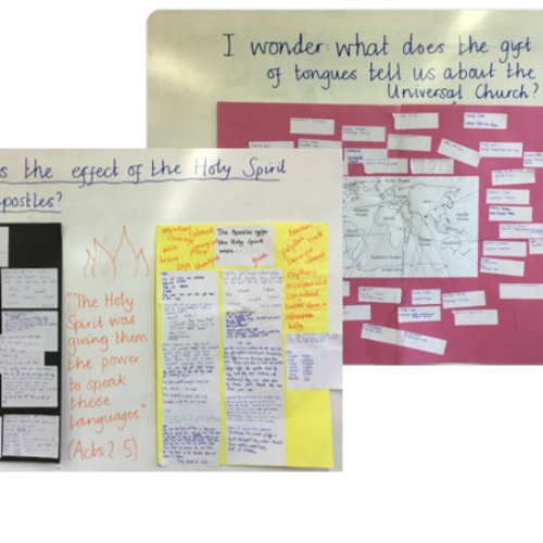 In RE lessons, the Y5 children have been discussing how the gift of tongues allows the Universal Church to grow. The children added a country and the languages they spoke onto a map. They reflected on how wonderful it is that the Word of God can be spread around the world as a result of this gift.